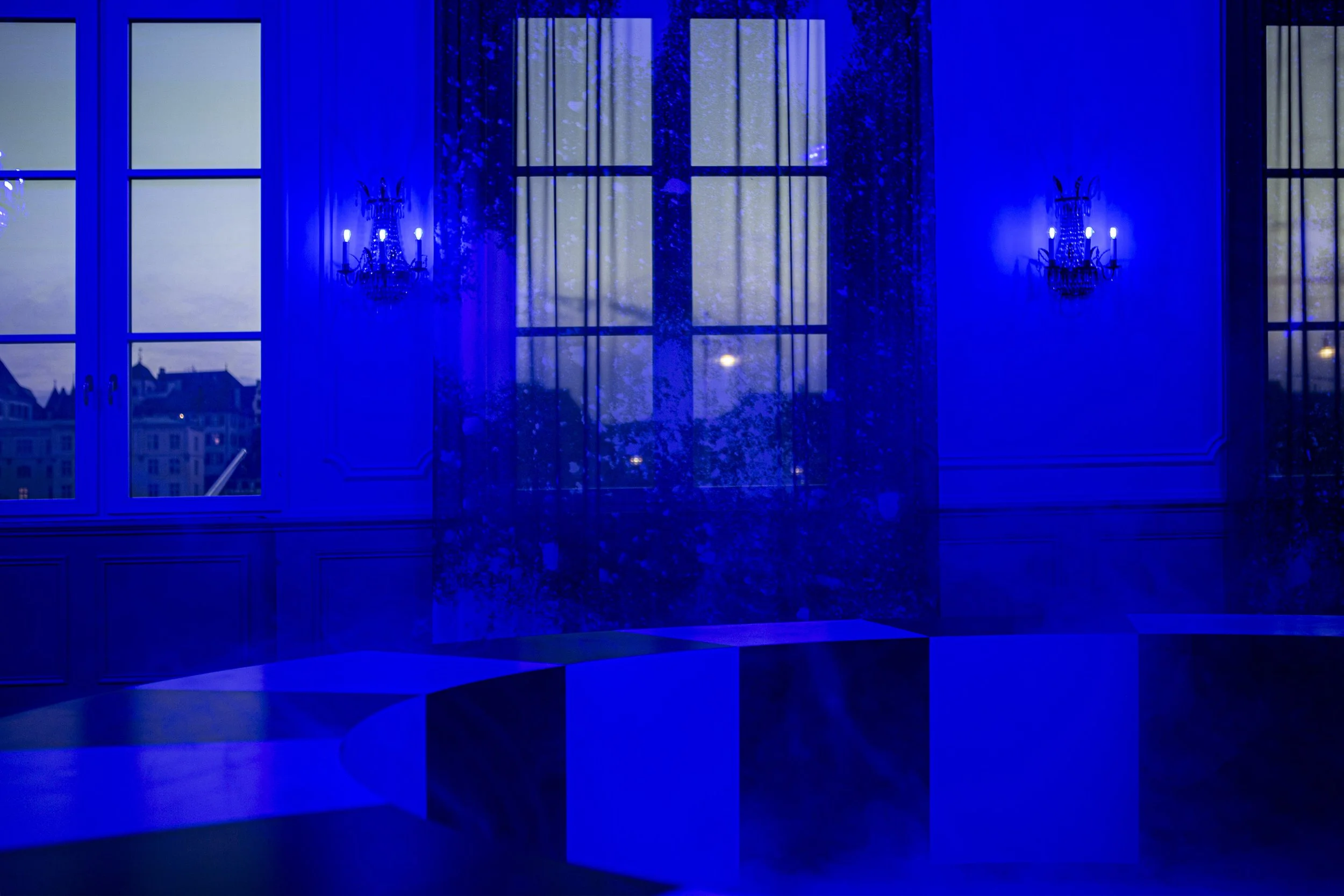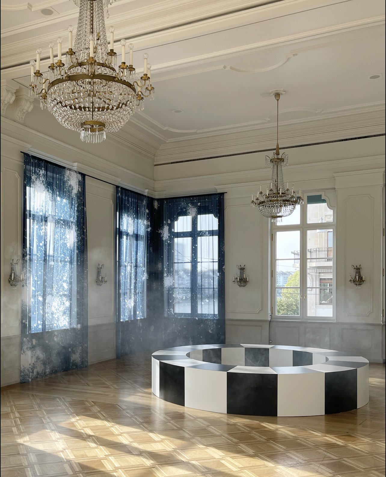 Oversized blue fabric panels span across the space, partially obscuring the floor-to-ceiling windows, while a black-and-white checkered circular form filled with smoke occupies the center of the hall.